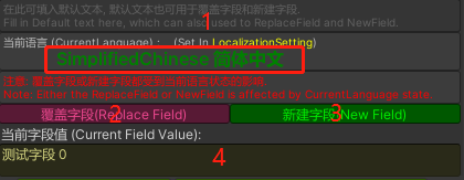 任何对象的 MyString 类型的字段, 通常都会有如上图红线框中的所展示的GUI 块. 看起来复杂, 实际上只有四个地方可以操作, 如下图中的 1 / 2 / 3 / 4:
